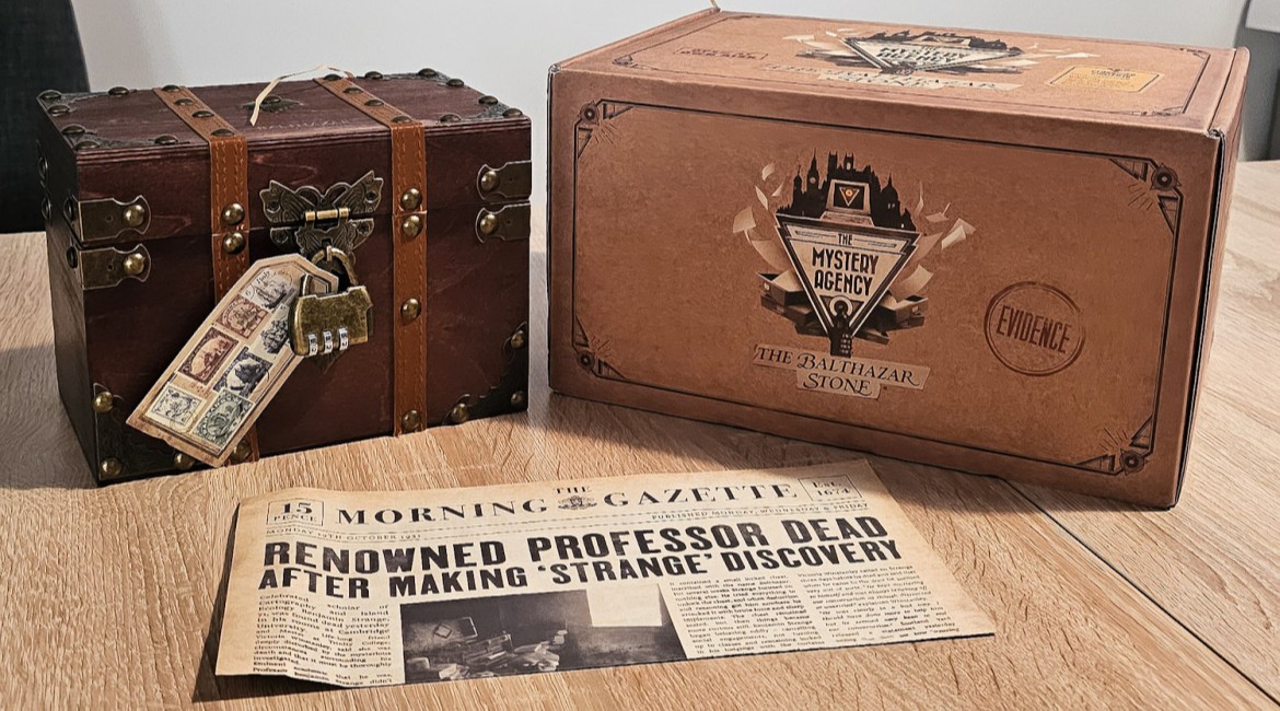 There is something incredibly satisfying about opening up the Mystery Agency parcel. The exterior box is solid and doesn’t betray much about the inside. You open the top and find a newspaper, “Renowned Professor dead after making ‘strange’ discovery” blazoned across the headline. Then you pull out the packing straw and find… a box.