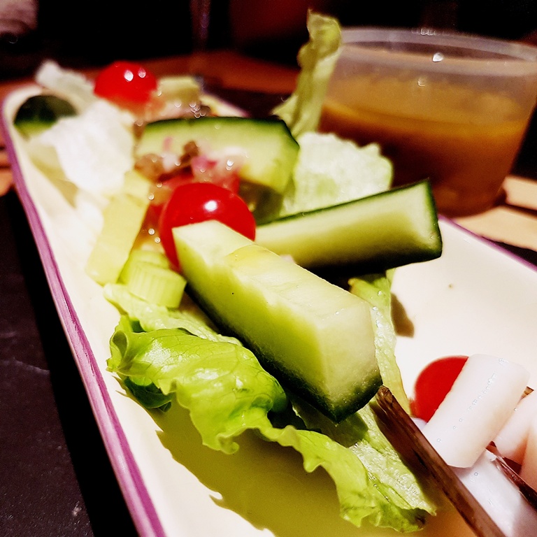 The salad is nice and simple but the presentation and dressing class it up a bit. If you like, you can witter on over dinner that the lettuce is the blade’s sheath, the tomatoes represent the blood spilled, the cucumber is cut into smaller blades and the spring onion is… the… tears shed? Because onion makes you cry?