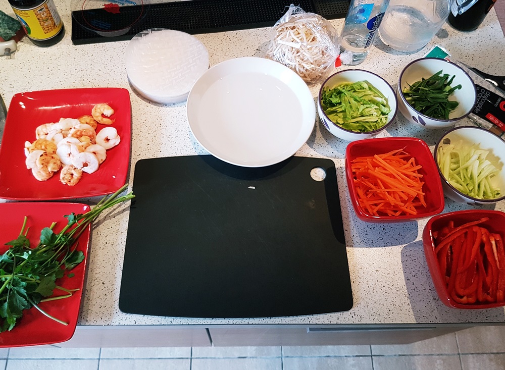 - When it’s flexible, pop it on your chopping board. On the edge nearest you, add your fillings – prawn, coriander, lettuce, carrot, pepper and beansprouts. You’ll need a bit of practice to make sure you put the right amount of filling in.